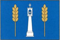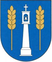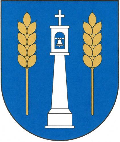 V modrém štítě mezi dvěma zlatými obilnými klasy stříbrná sloupová zvonička zakončená křížkem.