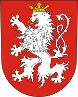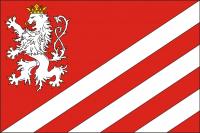 Červený list se třemi šikmými bílými pruhy vycházejícími z první, třetí a páté šestiny dolního okraje listu a končící v první, třetí a páté šestině vlajícího okraje listu. V horním červeném poli český lev vysoký dvě třetiny šířky listu. Poměr šířky k délce listu je 2:3.