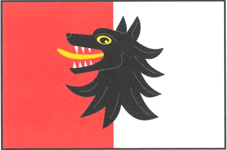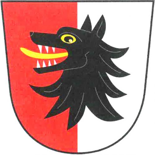 V červeno-stříbrně polceném štítě černá vlčí hlava se zlatým jazykem.