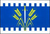 List tvoří tři vodorovné pruhy, bílý, oboustranně zubatý modrý a bílý, v poměru 3 : 10 : 3. Do modrého pruhu vyrůstají čtyři odkloněné žluté obilné klasy, každý s listem, mezi nimi bílý meč se žlutým jílcem hrotem k dolnímu okraji listu. Poměr šířky k délce listu je 2 : 3.