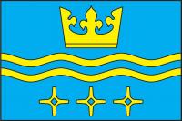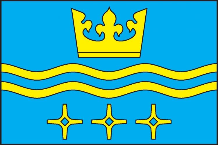 V modrém štítě vlnitě zlato-modro-zlatě dělené vlnité břevno provázené nahoře korunou, dole třemi (2,1) křížovými kypřicemi, vše zlaté.