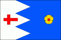 Modrý list s bílým žerďovým pilovitým pruhem, širokým jednu čtvrtinu délky listu se třemi zuby sahajícími do poloviny délky listu. V žerďové části červený položený latinský kříž, ve vlající části žlutá růže s červeným semeníkem a zelenými kališními lístky. Poměr šířky k délce listu je 2:3.