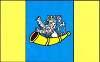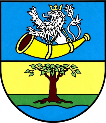 V děleném štítě nahoře v modrém poli ze zlaté trubky se závěsem vyrůstá stříbrný dvouocasý korunovaný lev. V dolním zlato - zeleně děleném poli nad modrou vlnitou patou vykořeněná lípa přirozené barvy.