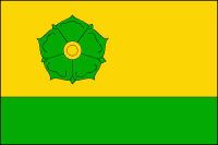 Ve zlatém štítě nad zeleným návrším se třemi (1,2) zlatými jablky zelená růže se zlatým semeníkem.