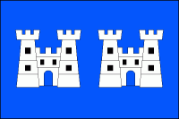 V modrém štítě s volnou stříbrnou čtvrtí dva stříbrné hrádky, každý se dvěma věžemi, prolomenou branou a cimbuřím.