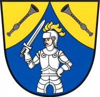 Zlatý štít se zvýšeným vydutým modrým hrotem, v něm polovina rytíře ve stříbrné zbroji s otevřenou přílbou se zlatým chocholem, s taseným stříbrným mečem a levou rukou v bok. V horních polích po jedné vztyčené černé píšťale, pravá šikmo, levá kosmo.