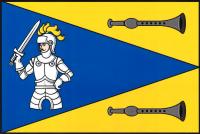 Žlutý list s žerďovým modrým klínem. V klínu polovina rytíře v bílé zbroji s otevřenou přilbou se žlutým chocholem, s taseným bílým mečem a levou rukou v bok. Klín nahoře a dole provázen vodorovnou černou píšťalou náustkem k žerďovému okraji listu. Poměr šířky k délce listu je 2 : 3.