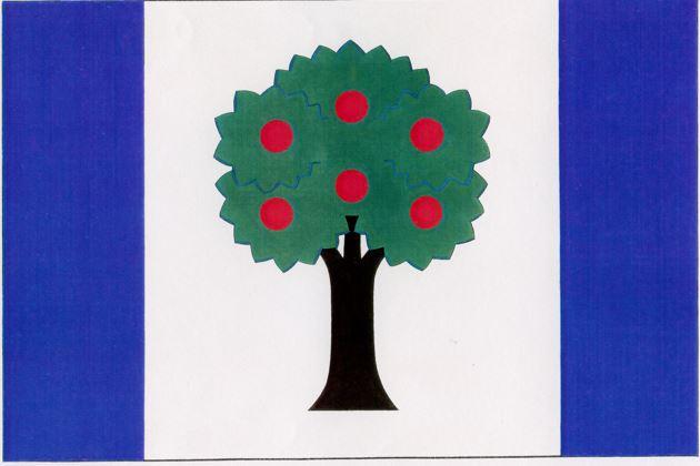 Ve stříbrném štítě na zeleném trávníku jabloň s plody přirozených barev, provázená vpravo modrým krojidlem a vlevo modrou radlicí.