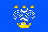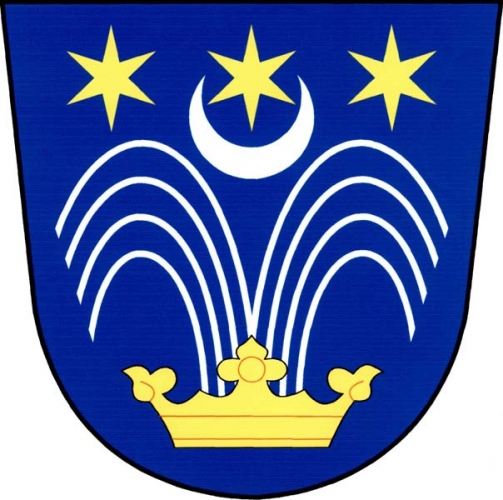 V modrém štítě zlatá koruna tryskající osmi (4+4) stříbrnými vřídelními prameny, nahoře tři zlaté hvězdy, pod prostřední stříbrný stoupající půlměsíc.