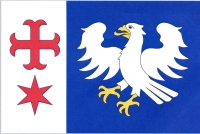 V modrém štítě pod stříbrnou cimbuřovou hlavou s kotvicovým křížem a hvězdou vedle sebe, obojí červené, stříbrný rozkřídlený dravý pták se zlatou zbrojí a jazykem.