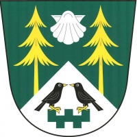 V zeleném štítě snížený stříbrný hrot, z něhož vyrůstají dva zlaté jehličnaté stromy, mezi nimi stříbrná svatojakubská mušle. V hrotu na volném zeleném cimbuřovém břevnu o pěti stínkách (3, 2) dva přivrácení černí kosi se zlatou zbrojí.