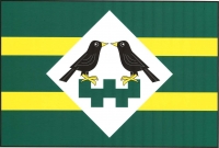 List tvoří pět vodorovných pruhů, střídavě zelených a žlutých, v poměru 2 : 1 : 2 : 1 : 2. Uprostřed kosmo položený bílý čtverec se stranami dlouhými sedm dvanáctin délky listu se dvěma přivrácenými černými kosy se žlutou zbrojí stojícími na volném oboustranně posunutě zubatém zeleném pruhu s pěti (3, 2) zuby. Poměr šířky k délce listu je 2 : 3.