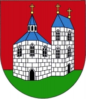 V zeleném trávníku červeného štítu polygonální kostel s vchodem a oknem v průčelí, dvěma okny v bočních zdech, stanovou střechou s polygonální věžičkou se stanovou střechou. Zleva přiléhá ke kostelní zdi hranolová věž, v průčelí s vchodem a dvěma okny nad sebou, v boční zdi dvěma okny nad sebou a sedlovou střechou. Stavba je stříbrná kvádrovaná, černé gotické vchody a gotická okna s kružbami a pruhy, střechy modré se zlatými makovicemi a křížky.
