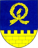 V modrém štítě nad sníženou kvádrovanou hradbou s cimbuřím doleva obrácený ledňáček v točenici, vše zlaté.