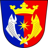 V modro-červeně polceném štítě pod zlatou korunou dvě vztyčené přivrácené ryby se zkříženými ocasními ploutvemi, pravá stříbrná, levá zlatá, mezi nimi zlatá osmihrotá hvězda.