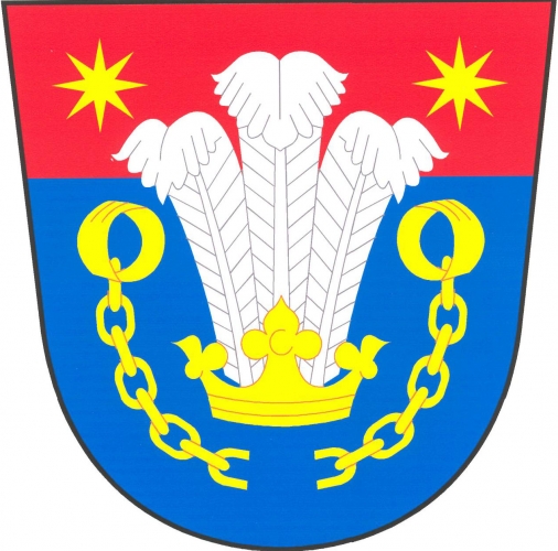 V modrém štítě s červenou hlavou vyrůstají ze zlaté koruny tři stříbrná pštrosí pera, provázená v hlavním poli do oblouku dole přeťatými pouty s okovy nahoře, v hlavě dvěma osmihrotými hvězdami, vše zlaté.