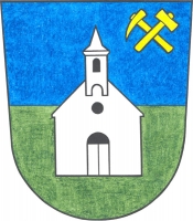V modro-zeleně děleném štítě čelně postavená stříbrná kaple s dveřmi, černým kruhovým oknem a věžičkou s černým oknem, provázená vlevo nahoře zlatými hornickými kladívky.