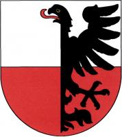 Ve stříbrno - červeně děleném štítě levá půle černé orlice s celou hlavou otočenou doprava a s červeným jazykem.