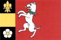 Červený list s černo-žluto-černě děleným žerďovým pruhem, širokým čtvrtinu délky listu. V horním černém poli žlutá lilie, v dolním černém poli bílá růže se žlutým semeníkem. Ve střední části listu bílý pes-věžník se žlutým jazykem a modrým obojkem se žlutými trny a lemováním. Poměr šířky k délce listu je 2 : 3.