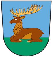 V modrém štítě na zeleném trávníku ležící jelen přirozené barvy se zlatými parohy a kopyty.