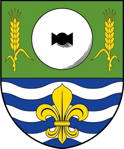 V zeleno-modře děleném štítě nahoře stříbrný mlýnský kámen s položenou černou kypřicí provázený dvěma zlatými obilnými klasy, každý se dvěma listy, dole tři stříbrná vlnitá břevna přeložená zlatou lilií.